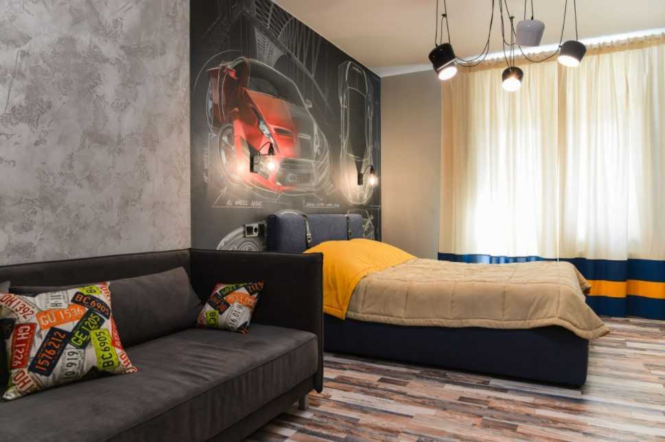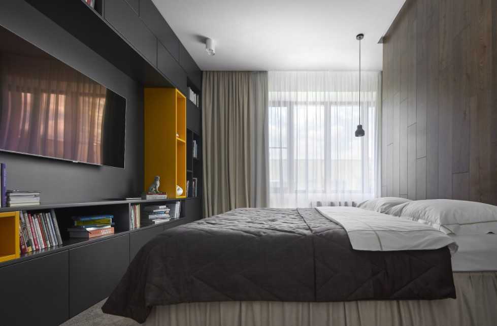 Мебель контрастная с фасадами «венге», но элементами «негро» в темном напылении. Шторы в теплом бежевом. Это могут быть пара гардин из прозрачной невесомой ткани с нанесенным на нее рисунком в стиле «урбанизм». Потолок матовый натяжной белый, можно сделать его в тонах ванили.