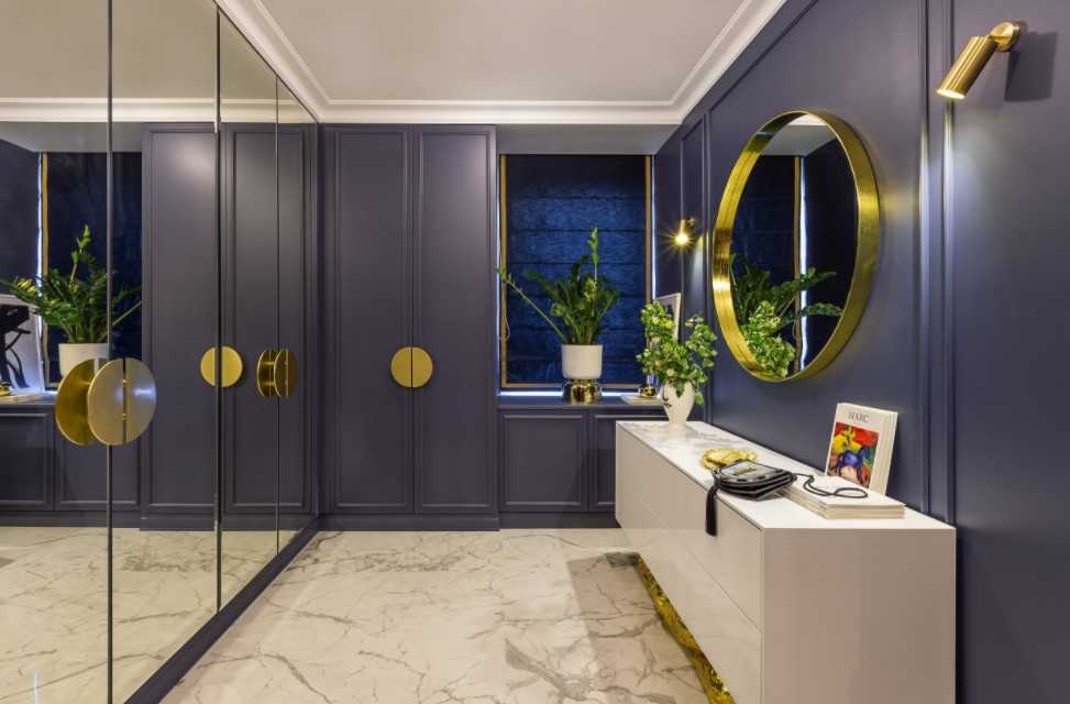 Синий — темный, поэтому с ним хорошо сочетаются как приглушенные, так и насыщенные тона — ирландский крем, кофе, корица, кориандр, замша.