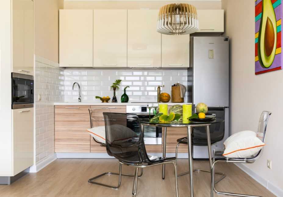 Основные элементы обстановки большинства кухонь – кухонный гарнитур, обеденная группа. В просторной комнате или кухне-гостиной может добавиться диван и сервант. Нежелательно выбирать мебель в тон стенам, чтобы интерьер не сливался в сплошное одноцветное пятно.
