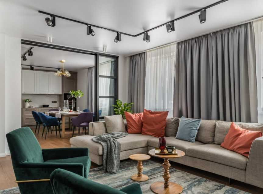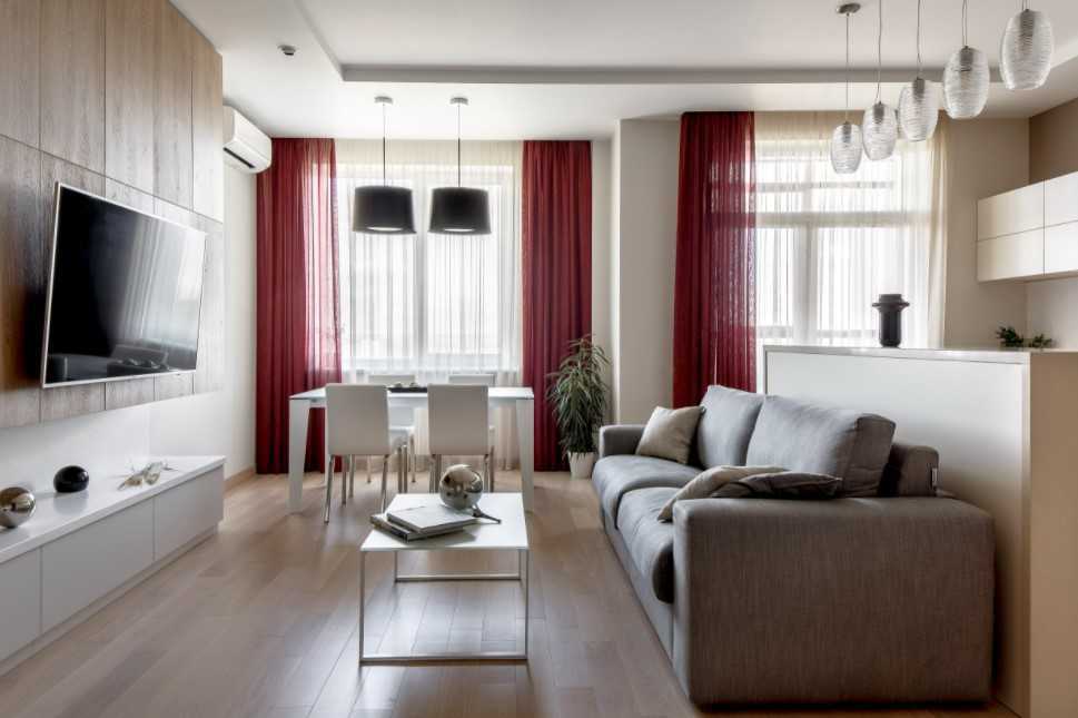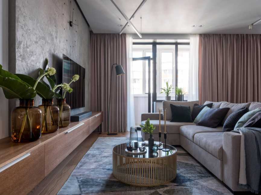 Цветовая гамма может равномерно распределяться по гостиной. Исключением бывают помещения, в которых совмещается несколько функциональных зон. Именно в одной из них получается самая высокая концентрация оттенка, а минимум получает остальная площадь.