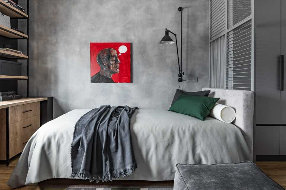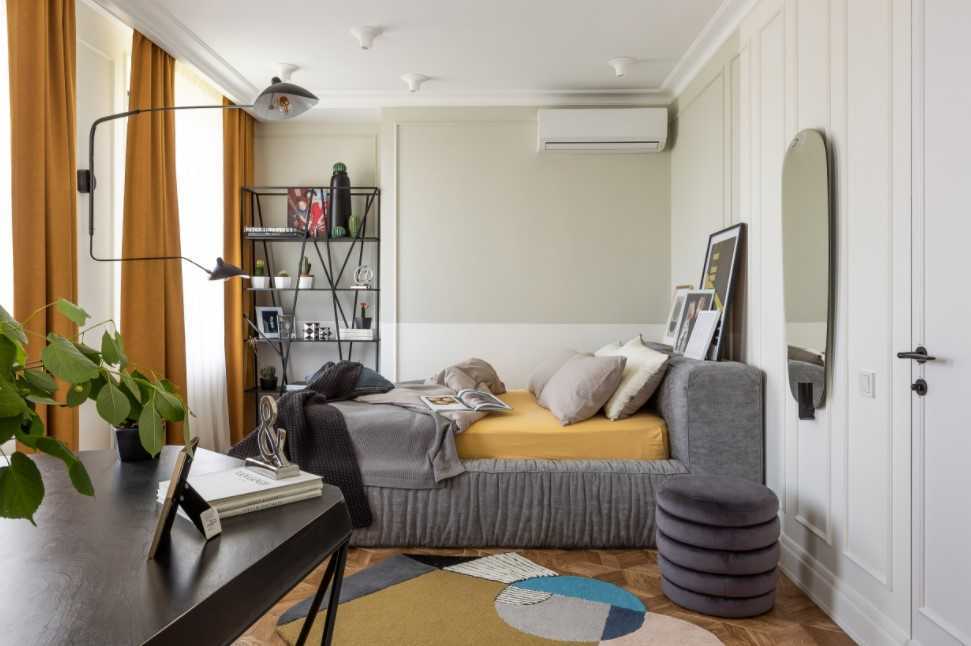 Светлые оттенки расширяют комнату, а сочетание двух видов серого помогает скорректировать размеры, придать правильную форму. Оказывает успокаивающее действие на нервную систему. Для разнообразия можно добавить зеленый или металлические элементы.