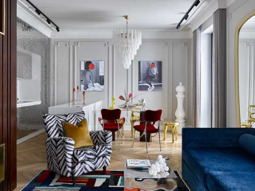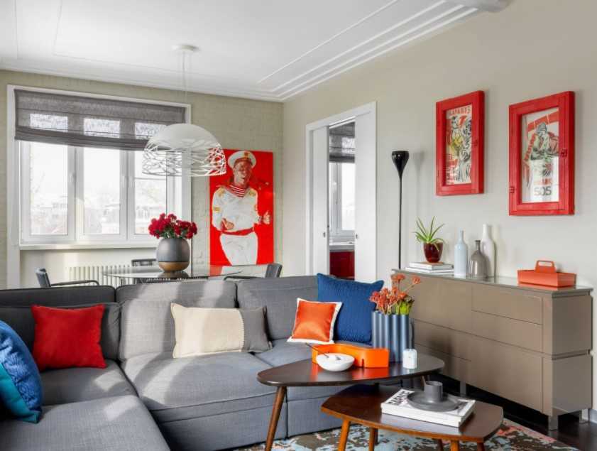 Если хочется ярких красок, то акцентировать внимание можно на ярком диване или на разноцветных обеденных стульях