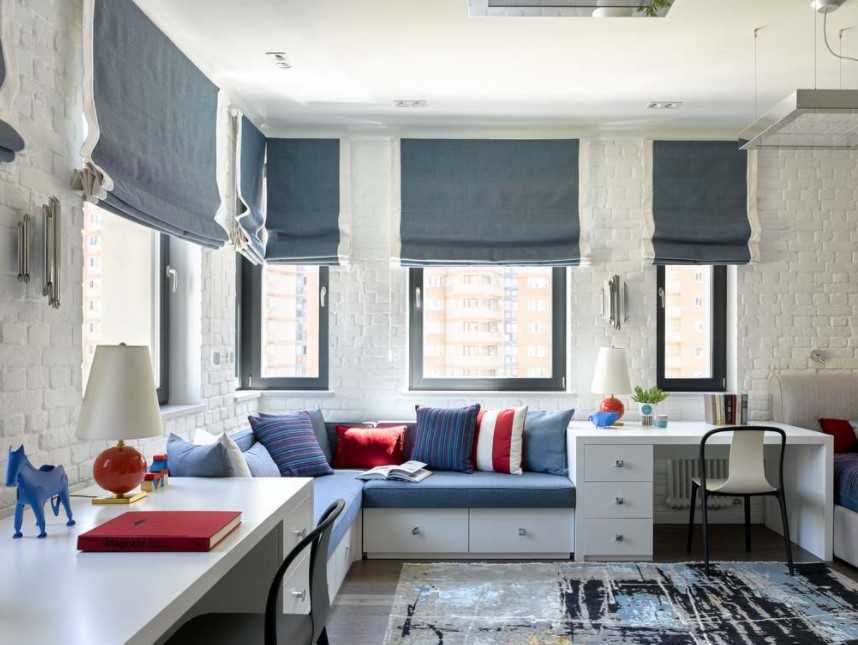 Во всех помещениях квартиры логично при ремонте брать в качестве фона беж, а синим акцентировать детали: подушки, картины, шторы, небольшое кресло или пуф украсят комнату.