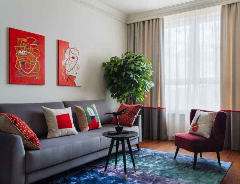 - Красный. Энергичный, даже агрессивный оттенок. Не переусердствуйте с его применением: алые шторы или акцентная стена — это чересчур. Зато небольшие аксессуары сделают комнату динамичнее.