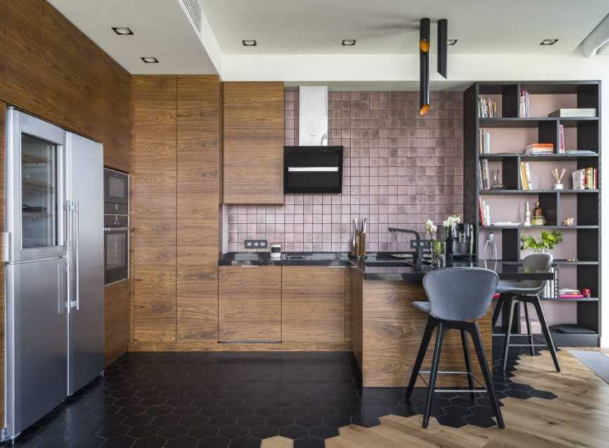Тут стоит обратить внимание на мебель в светлых оттенках бежевого цвета и темный деревянный пол. Такое оформление по достоинству оценят домохозяйки, которые проводят на кухне много времени