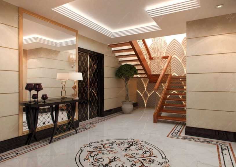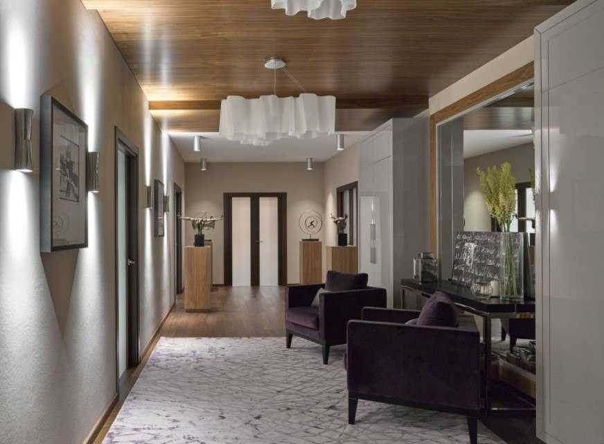 Такое направление хорошо подойдет любителям роскоши. Видя такой дизайн прихожей в современном стиле, можно понять, что в этом доме проживают обеспеченные люди. Чтобы добиться такого эффекта, в этом году дизайнеры сочетают темные оттенки дерева с блестящими поверхностями и декором. В качестве замены таких дорогих элементов можно использовать темные покрытия на стенах, а для декора использовать разнообразные люстры, светильники и так далее.