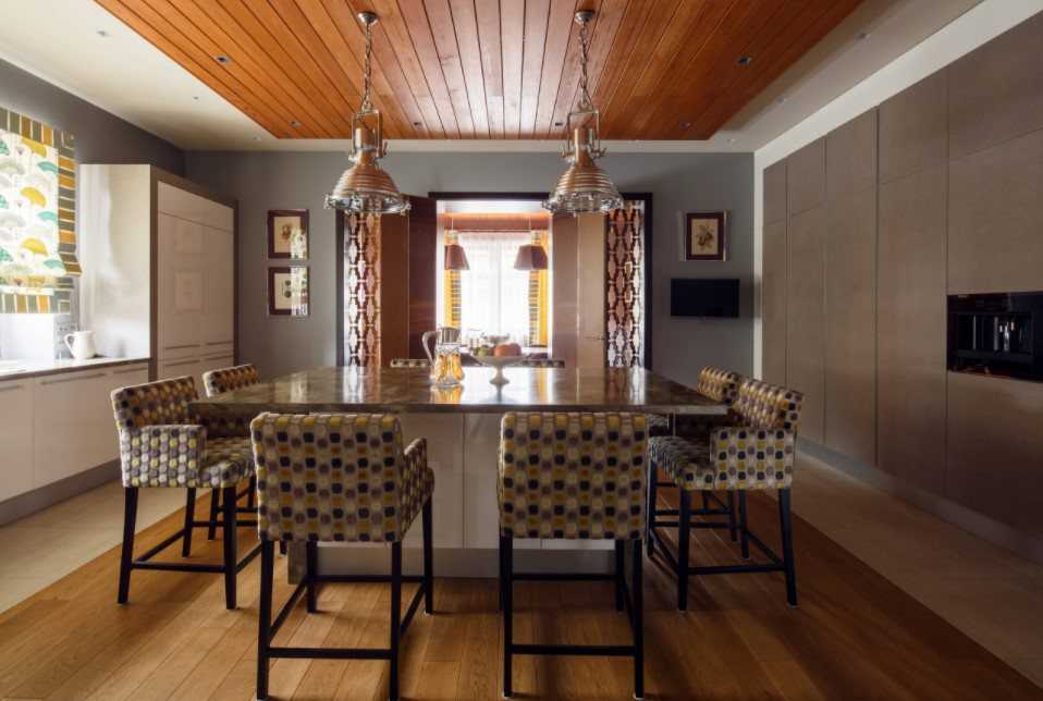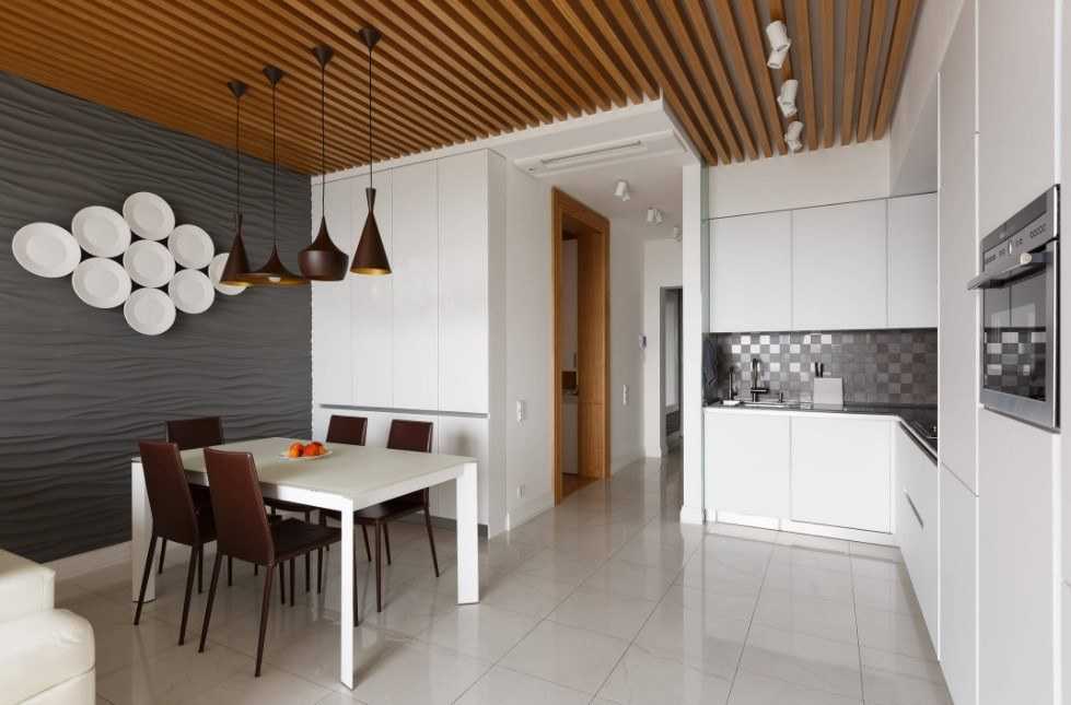 Еще один актуальный тренд – комбинирование разных отделочных материалов. Сочетание облицовок поможет любому пространству заиграть новыми красками. Главное – знать меру в комбинировании, чтобы дизайн потолка не получился слишком наляпистым и безвкусным.