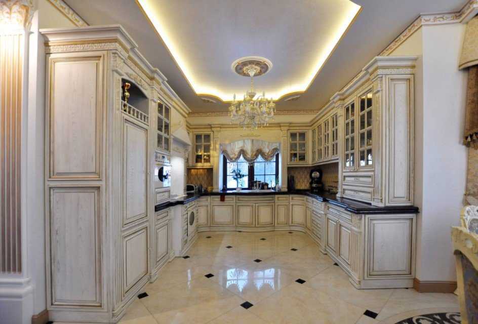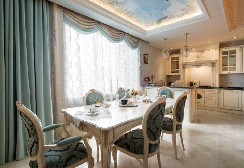 Классический стиль помещения подразумевает использование простого варианта дизайна потолка: белый с центральной люстрой. Однако тут допустимы легкие оттенки, например, бежевого или серого цвета однотонного полотна.