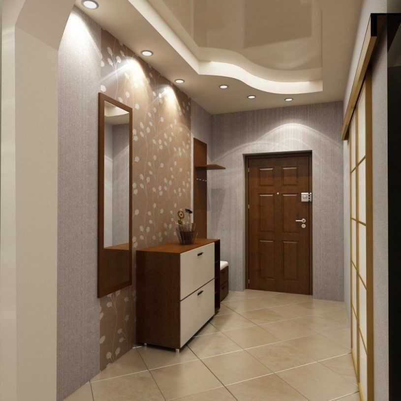 - гипсокартон – позволяет создавать разноуровневые потолки. Благодаря этому появляется возможность использовать разные виды освещения и за счет этого визуально скрыть некоторые недостатки ремонта, если таковые имеются. Поэтому потолки из гипсокартона в прихожей очень часто используются;