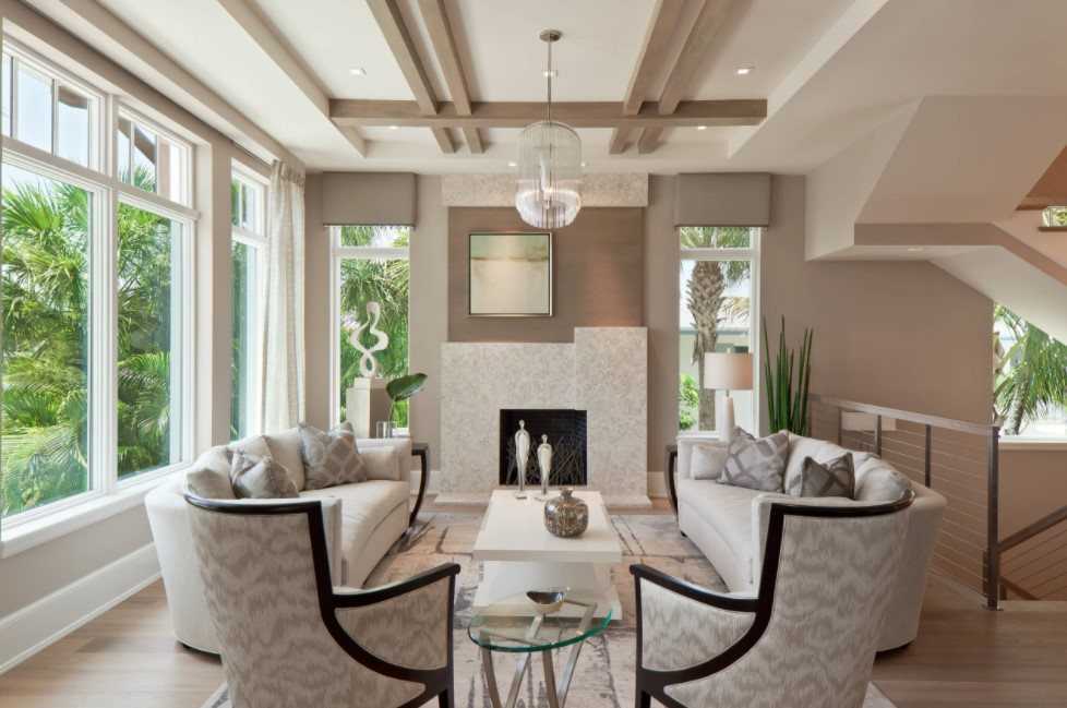 Одни из самых просторных помещений в доме или квартире обычно отводится на гостиную комнату. Именно поэтому потолки могут быть самыми разными и интересными. Если потолки в вашем помещении низкие – советуем остановится на классических вариантах покрытия. К примеру, можно выполнить окрашивание потолка с использование плавного градиента. Потолки, которые выполнены в венецианской технике с использованием штукатурки, выглядят эффектно и хорошо вписываются во многие стили, включая классический.