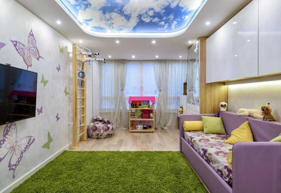 Можно применить белый одноуровневый потолок, который придаст законченный вид комнате.