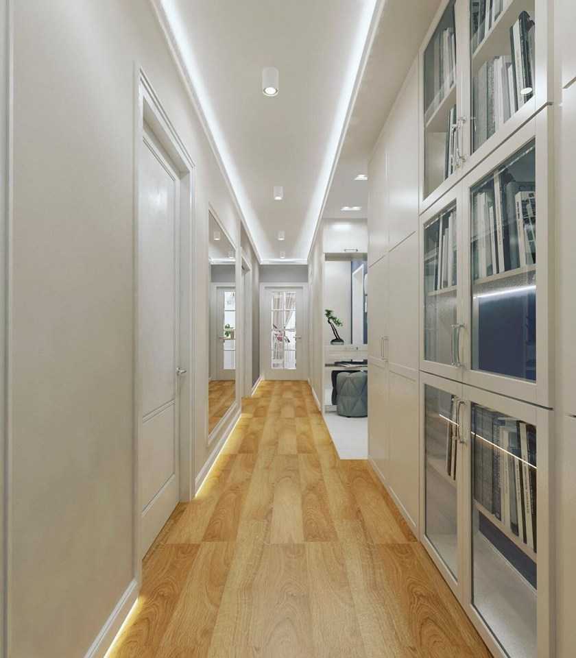 Натяжной потолок самый дешёвый и быстрый. Если в начале и конце коридора есть двери или арки, т.е. плоскость потолка заканчивается там, а не переходит в соседнюю комнату, то у этого варианта практически нет минусов.