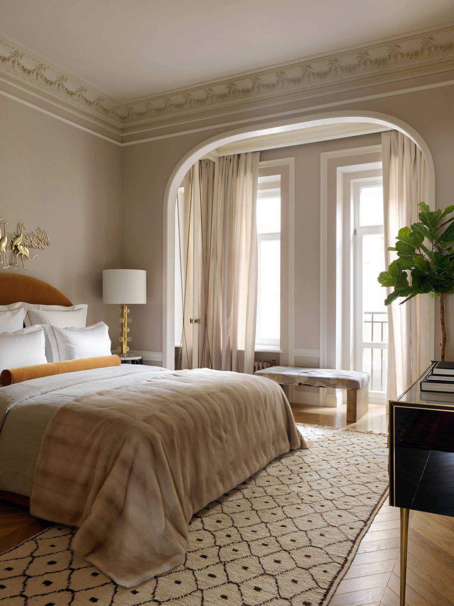 Чтобы в классическом стиле создать уютную атмосферу, в помещениях используют детали. Мягкие валики на кровати и диване создают ощущение комфорта. Холодность отделки пола дополняют ковром с длинным ворсом. Разбавить строгость пространства помогут семейные фотографии в фигурных рамках.