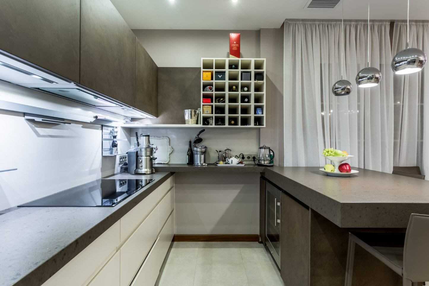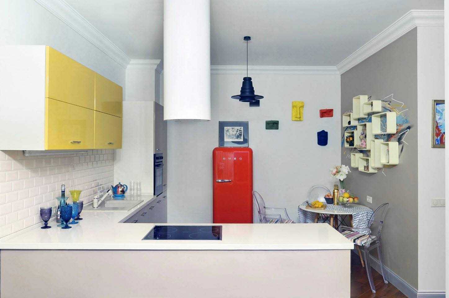 В данном помещении подвесные полки могут быть предназначены для разных целей. В рабочей зоне может расположиться специальная подвесная полка под микроволновку и другую бытовую технику, а обеденный уголок будет хорошо дополнен подвесной конструкцией под телевизор.