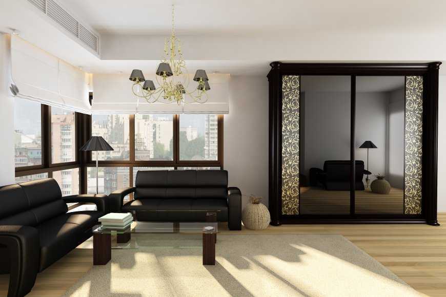 Классика никогда не выходит из моды. Так и классический стиль может легко вписаться в современный дизайн. Для классической гостиной подойдет большой зеркальный шкаф во всю стену. На дверцах разместите белый цветочный орнамент и экзотических птиц. Зеркала может обрамлять золотая отделка — гостиная получится элегантной и изящной.