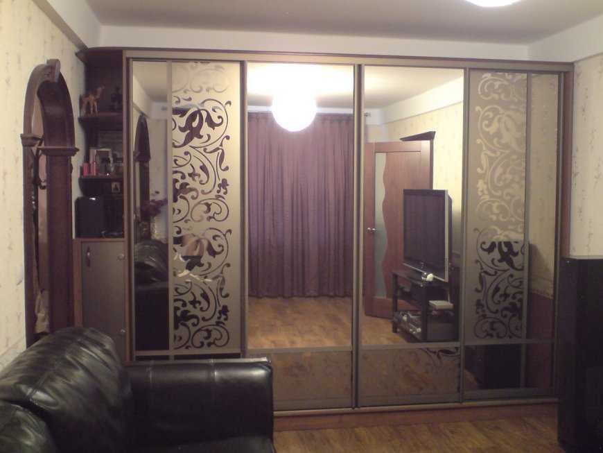 - зеркальный шкаф купе в гостиную – обычный метод зрительно увеличить комнату. Зеркало отражает и свет, и предметы, буквально «удваивая» пространство. Лучше комбинировать зеркальные створки с деревянными или матовыми стеклянными с тем, чтобы не слишком сильно изменять пропорции;