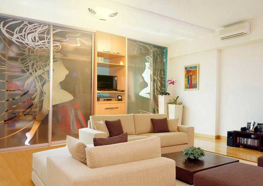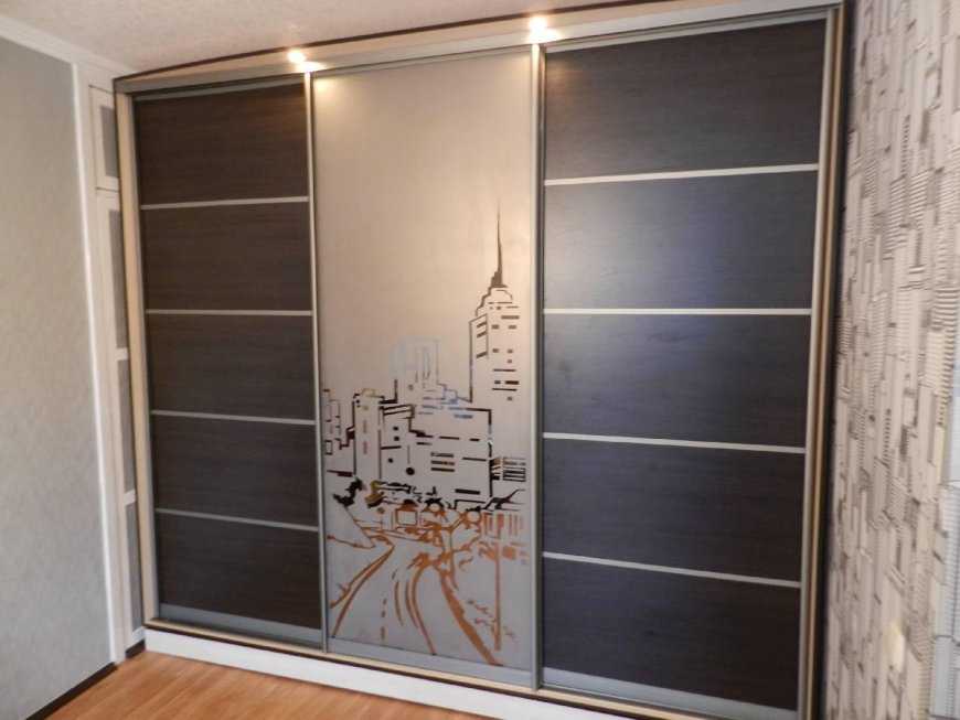 Декоративные стекла – перечисленные выше разновидности. Шершавый пескоструйный рисунок или матовое стекло можно комбинировать с раздвижными зеркалами. Такой дизайн дверей шкафа-купе подходит для классического и современного интерьера.