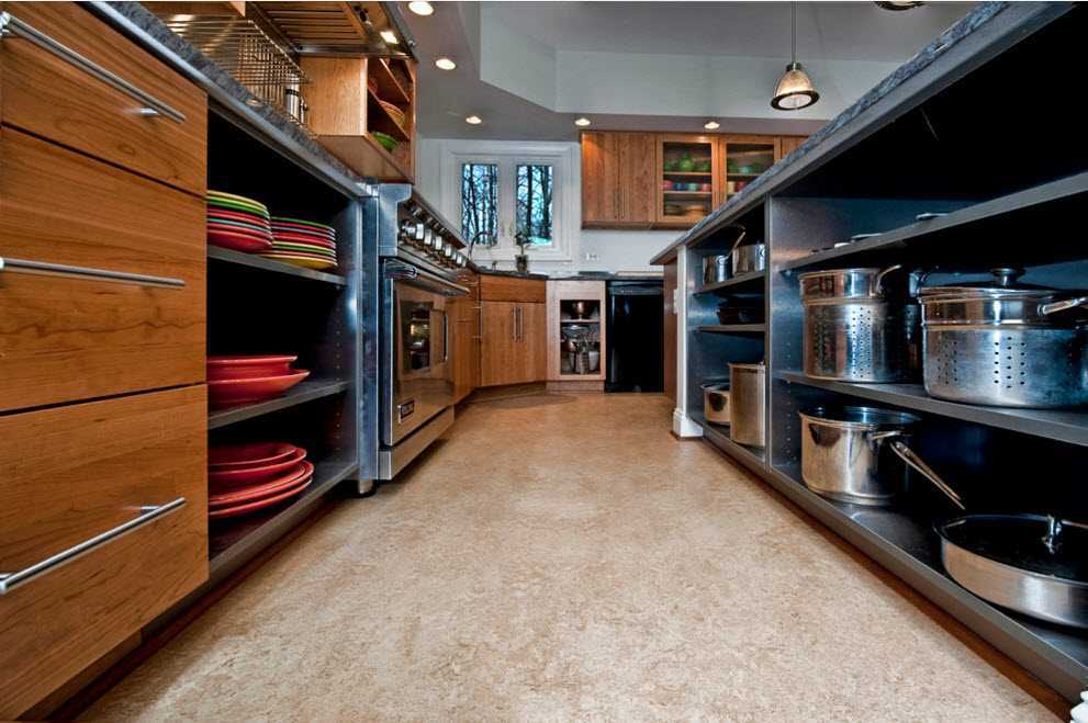 Обычно линолеум укладывают в помещениях, оформленных в современном стиле. Но стоит взглянуть на то, как он выглядит в этой классической кухне, былые предубеждения сразу теряют всякий смысл.