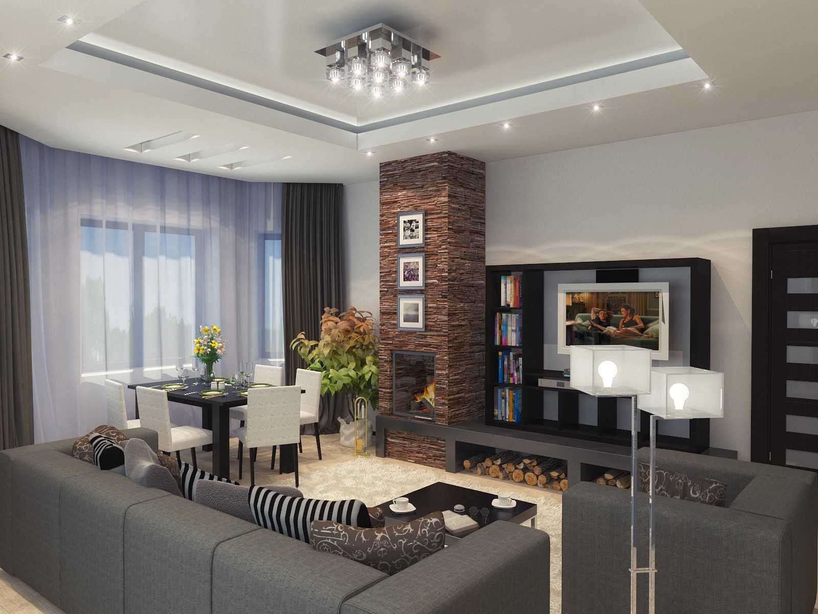 Тем, кому подобное решение не подходит, предлагают разнести камин и телевизор по стенам, расположенным перпендикулярно относительно друг друга. Подобный подход хорош тем, что предметы мебели будут общими в зоне отдыха, что сэкономит пространство и финансы.