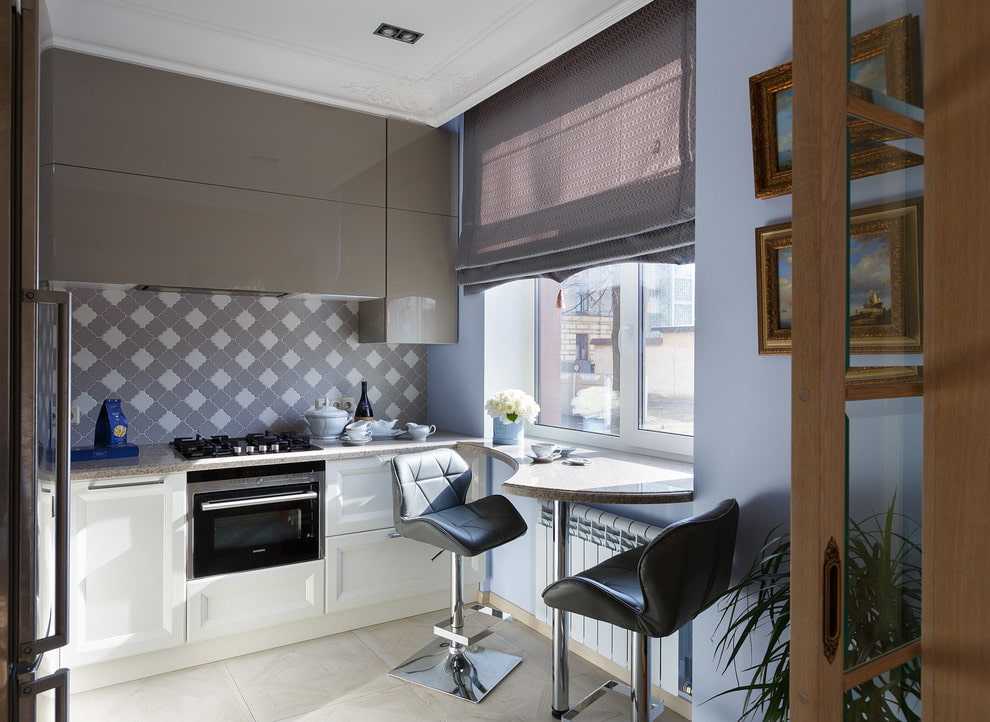 Все чаще роль барной стойки исполняет подоконник, который облицовывают прочным материалом и при необходимости делают более широким. Таким образом дизайн маленькой кухни 2020 становится более привлекательным и удобным.