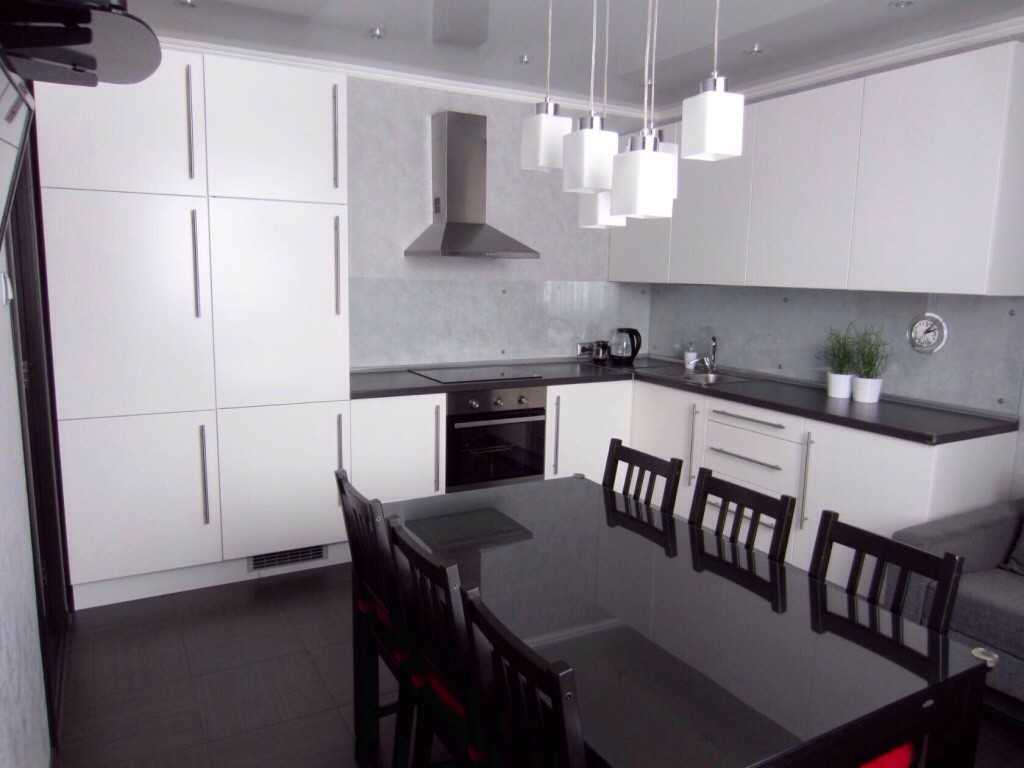 Трехметровая кухня не во всю стену отличается очень гармоничным и стильным обликом. Подобная планировка освобождает место для расположения обеденной группы.