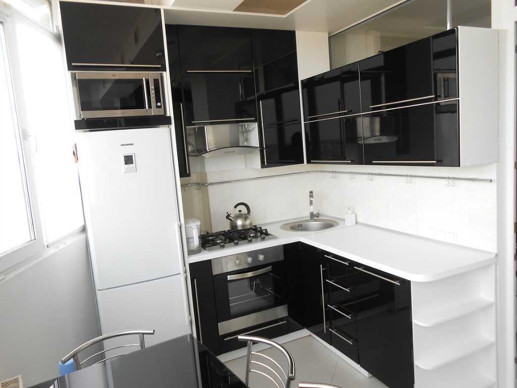 - Выбирать высокий гарнитур с множеством ниш для использования, так как в помещении доминирует ограниченность пространства.