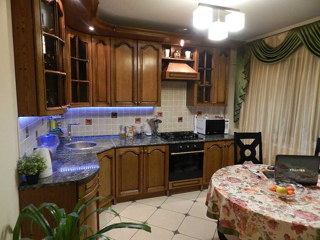 На фото деревянный гарнитур с черной столешницей, выполненный на правый угол.
