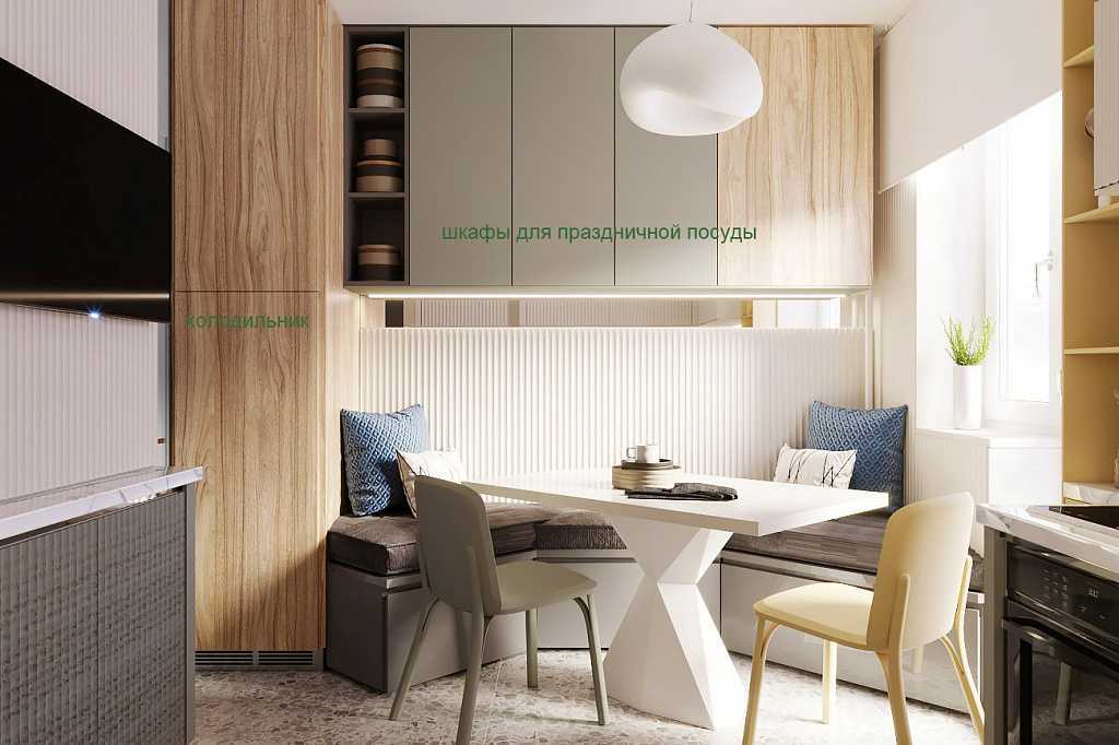 Это упорядочивает свободную площадь и делает кухонную эргономику более правильной для восприятия.