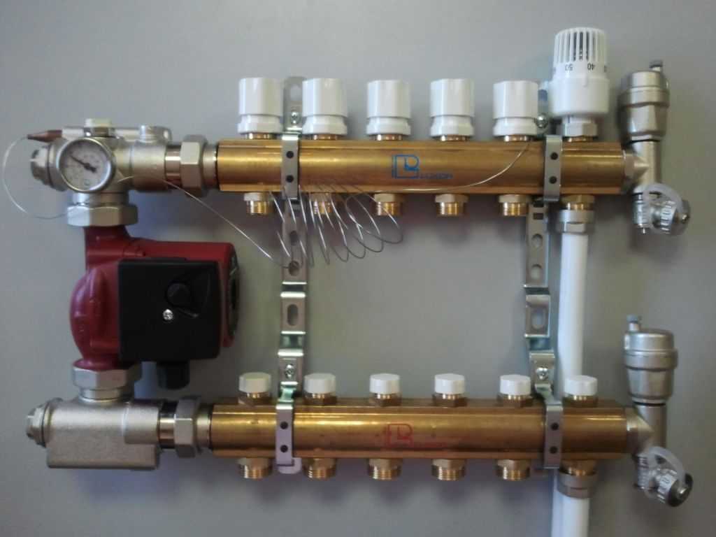 О том, как правильно установить байпас в схему «теплый пол», нужно рассказать более подробно, так как температура теплоносителя при таком решении не должна быть более 45 °С. Монтаж теплого пола предусматривает установку коллектора, а обводная перемычка на нем выполняет роль обходного отрезка отопительной трассы и узла смешения.