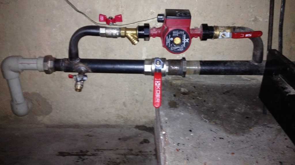 - К примеру, магистраль отопления, на которой смонтирован циркуляционный насос. Первое, что следует сделать для установки байпаса, это снять его и немного переделать магистраль — в частности, понадобится несколько увеличить расстояние между резьбовыми концами, на которые был накручен насос. Определить это расстояние лучше всего по месту — в смысле, собрать насос и узел вокруг него как положено.