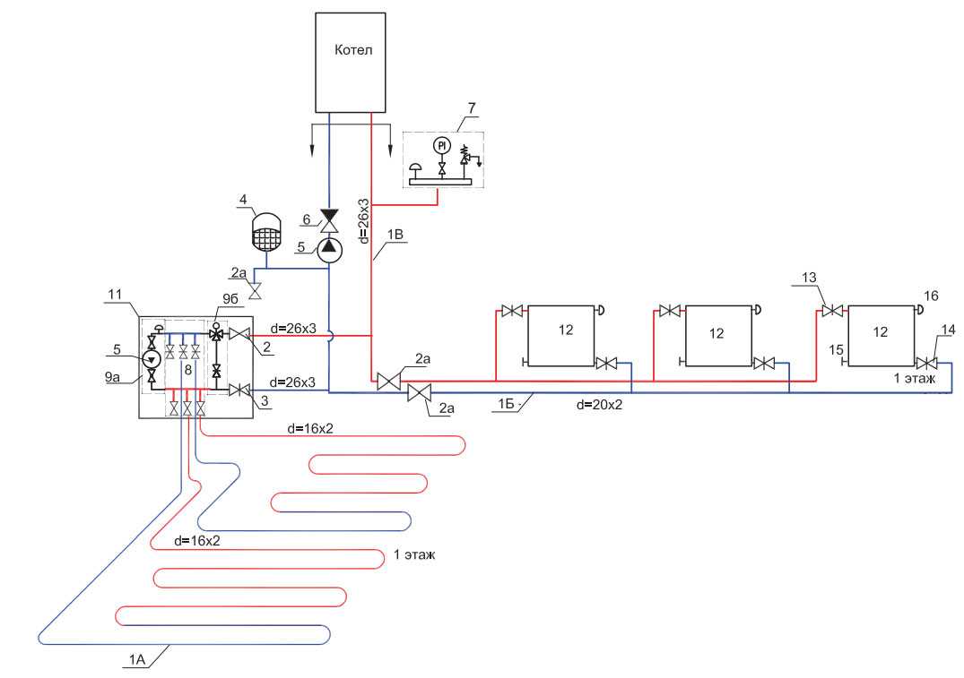 Схема подключения водного теплого пола к центральной системе через отдельный ввод