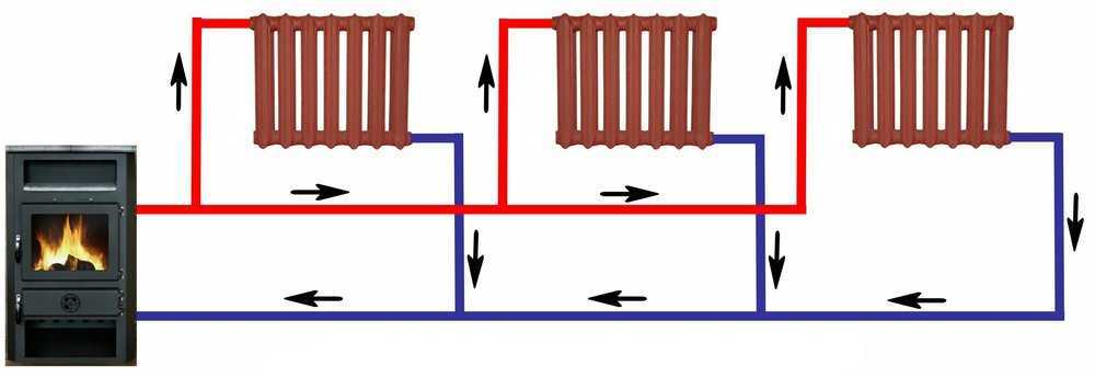 Это простая горизонтальная схема выкладки с одной трубой, которая подключена последовательным образом ко всем батареям. Подача носителя через верхний отвод – отток через нижний, таким образом, вторая батарея получает чуть более остывший носитель, третья – еще более прохладный. От крайнего радиатора обратка возвращается в бак для прогрева.