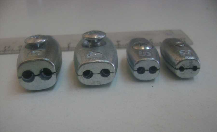- Клиновый зажим. Относится к числу специализированных, и подходит для соединения такелажных тросов или канатов большого диаметра (до 100 мм). Клиновые зажимы отличаются повышенной износостойкостью, поскольку для соединения используются втулки из антифрикционной бронзы, а для надёжного обхвата троса или каната применяются шайбы из мягкого алюминия.
