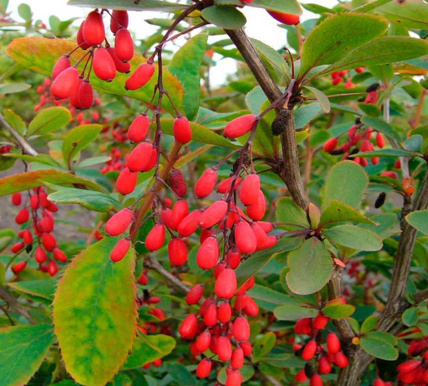 - Барбарис Тунберга. Кустарник с очень разветвленной кроной и небольшими листьями, которые в зависимости от сорта могут различаться их цветами : темно-зеленый; красный; розово-красный; оранжево-красный; золотисто-зеленый; светло-зеленый. Часто используется для формирования живых изгородей.Многолетник не требует особого ухода. Хорошо растет на солнечных участках, но можно посадить и в полузатененных местах. Дополнительным украшение этого многолетнего кустарника являются ярко-красные, блестящие плоды, появляющиеся осенью.