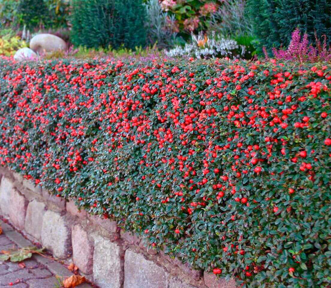 Из кизильника нередко создают живые изгороди в парке и частном саду. После того как закончится пышное цветение, на кусте формируется большое количество плодов насыщенного окраса.