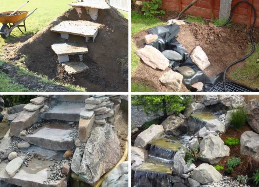 Если на участке имеется естественный пруд, лучше использовать его для строительства каскадов и водопадов. Если сооружают искусственный бассейн, то параллельно с обустройством водопада. Пошаговая инструкция сложна, но общее руководство по сооружению сходно как при строительстве каскада-стены, так и самодельного прудика из ванной.