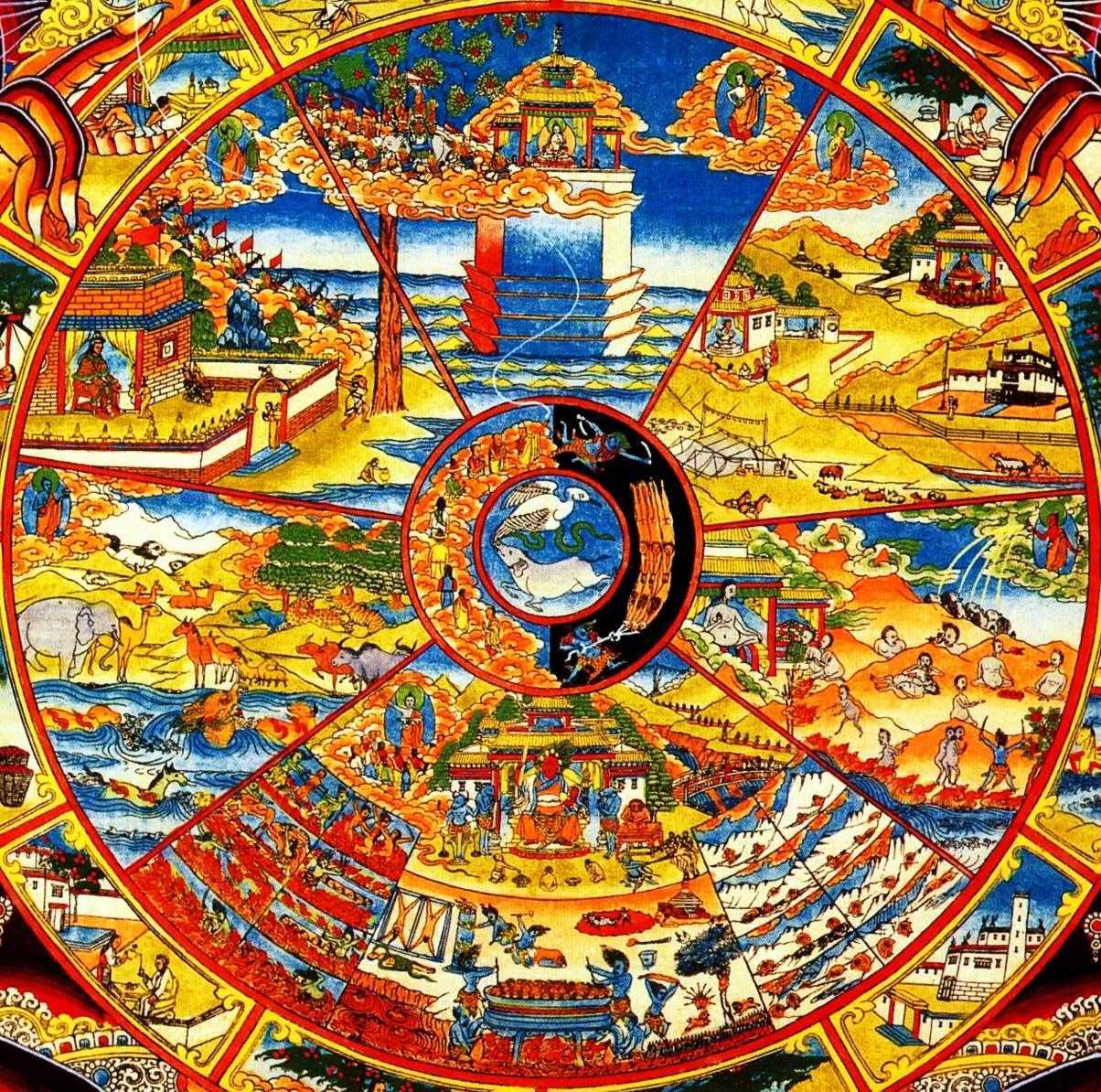 Согласно тибетцам, заключенные в колесе перерождений, мы вынуждены скитаться по шести реальностям мироздания, как изображено на схеме: человек, голодный дух, ад, животное, полубог и бог