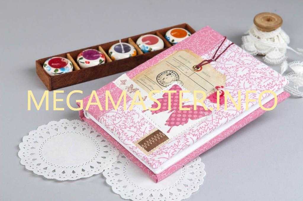 С использованием текстиля на страничках блокнота можно добиться его оригинального, необычного внешнего вида. С ее помощью можно создать разнообразные фигурки и приклеить их внутрь.