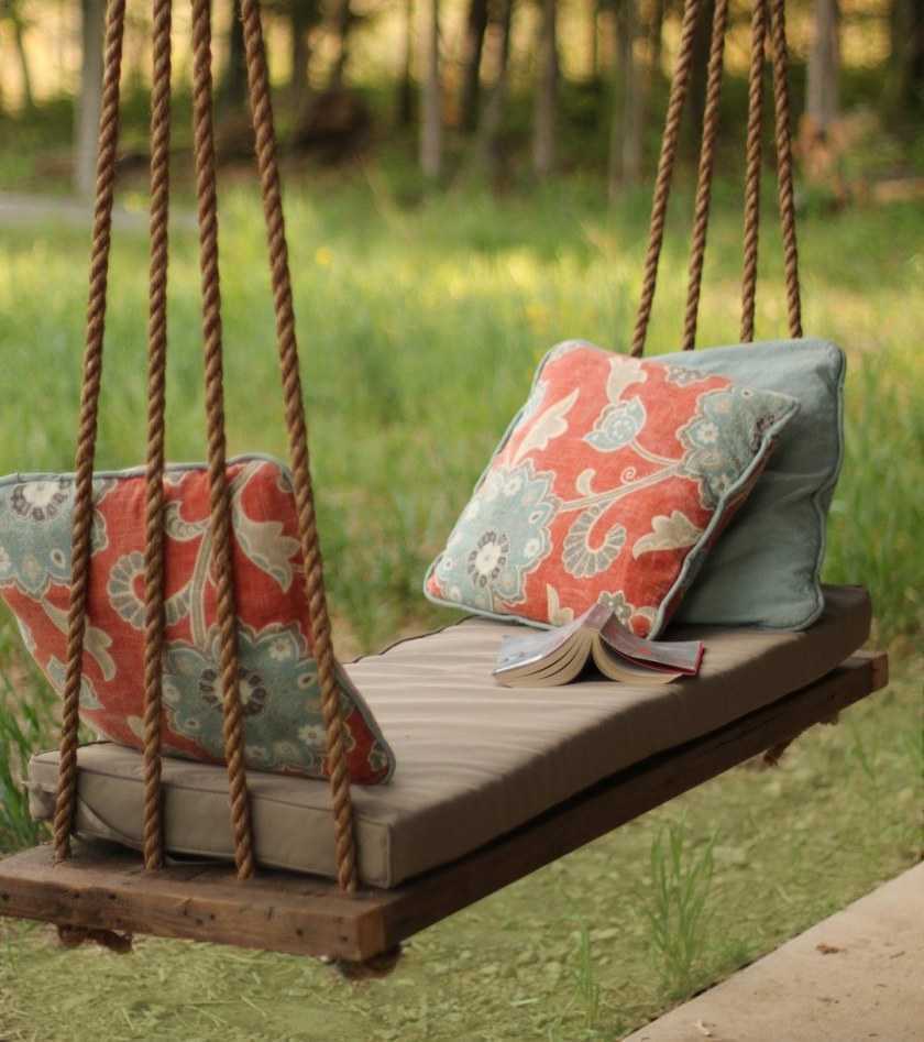 Из деревянного поддона можно изготовить качели для дачи различной конфигурации. Этот элемент можно закрепить в подвешенном состоянии за углы при помощи веревок. В таком положении они смогут должным образом выполнять свою главную функцию. Чтобы было удобнее раскачиваться на таких качелях, на поддон можно уложить ненужный матрас, а сверху постелить простыню. Отсутствие спинки можно компенсировать при помощи пары подушек, которые сделают ещё более приятным использование такой конструкции.