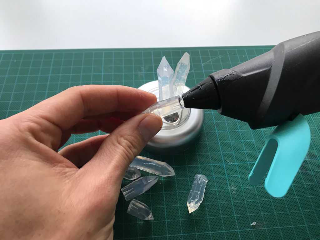Теперь все, что вам осталось сделать, так это при помощи клеевого пистолета приклеить эти кристаллы к светодиодной лампе. Если у вас еще остались клеевые палочки, то украсьте края светильника небольшими осколками, создавая полную композицию.
