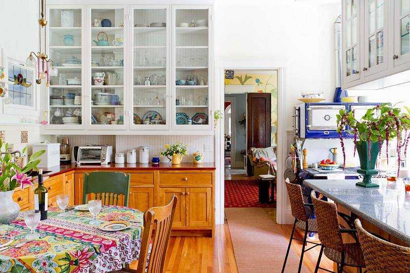 - в кухне, наоборот, кухонный гарнитур нужно встроить до самого потолка и хорошо, если его цвет будет совпадать с цветами потолка и стен, это сотрет все границы.
