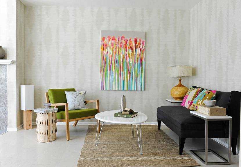 Высокий напольный торшер и большая картина на стене визуально увеличивают высоту потолка