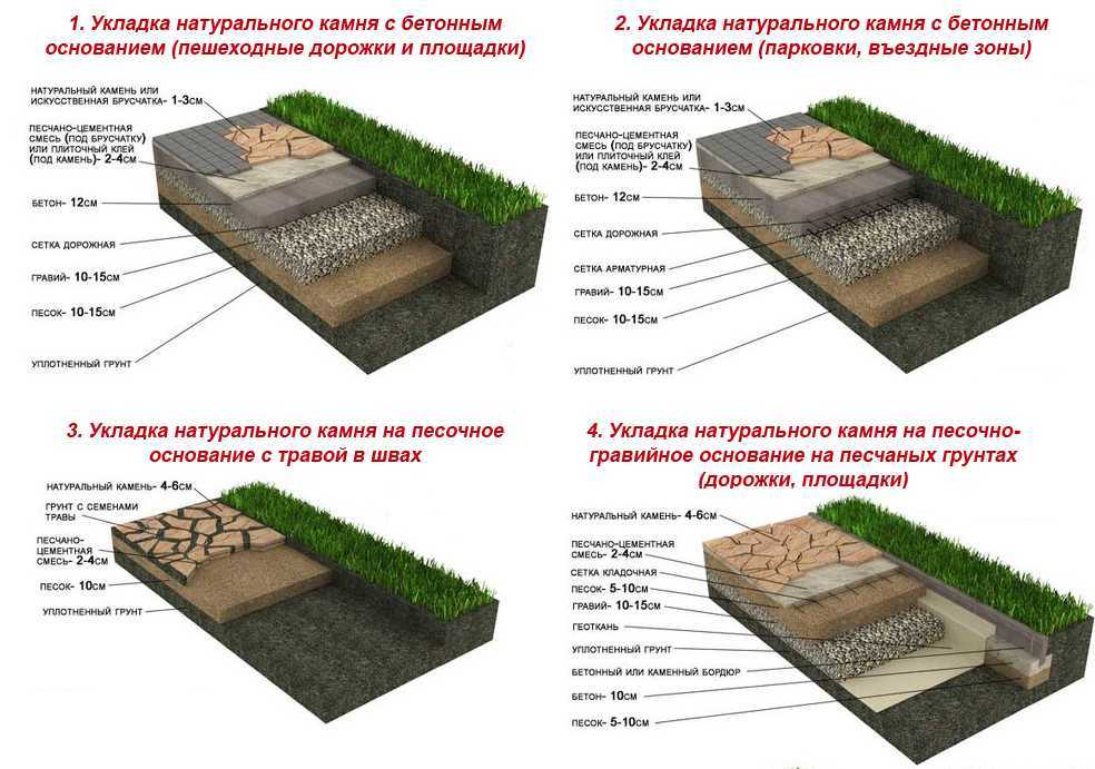 Перед тем как уложить натуральный камень для дорожек или подготовить площадку под автомобиль, грунт необходимо уплотнить виброплитой. Если плотность грунта нестабильна, он склонен к вибрации или сезонным подвижкам, на месте укладки сооружается бетонная стяжка. В процессе ее сооружения выбранный участок размечается, подвергается планировке и заливается бетоном. Пока бетон будет подсыхать и твердеть, необходимо отсортировать каменный материал по толщине, размеру и форме. Чтобы сравнить куски камня по конфигурации, их промывают в проточной воде, чистят специальной щеткой, сушат и раскладывают недалеко от строительной площадки.