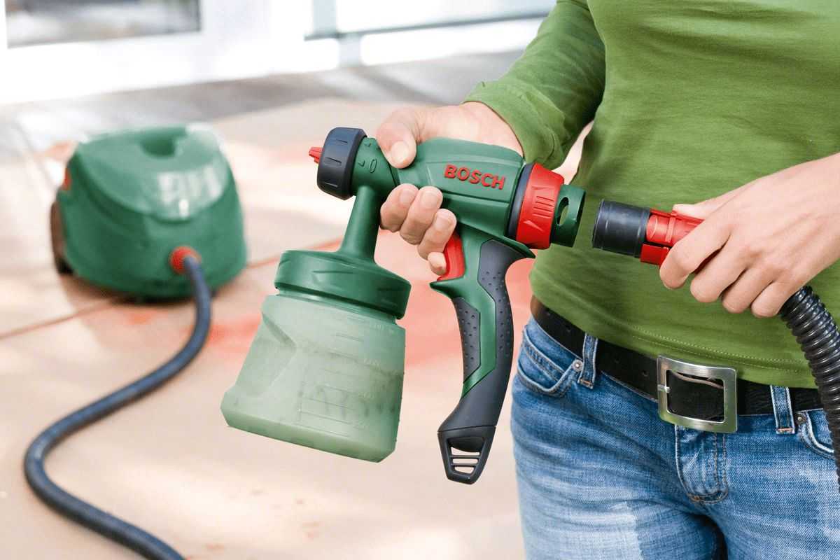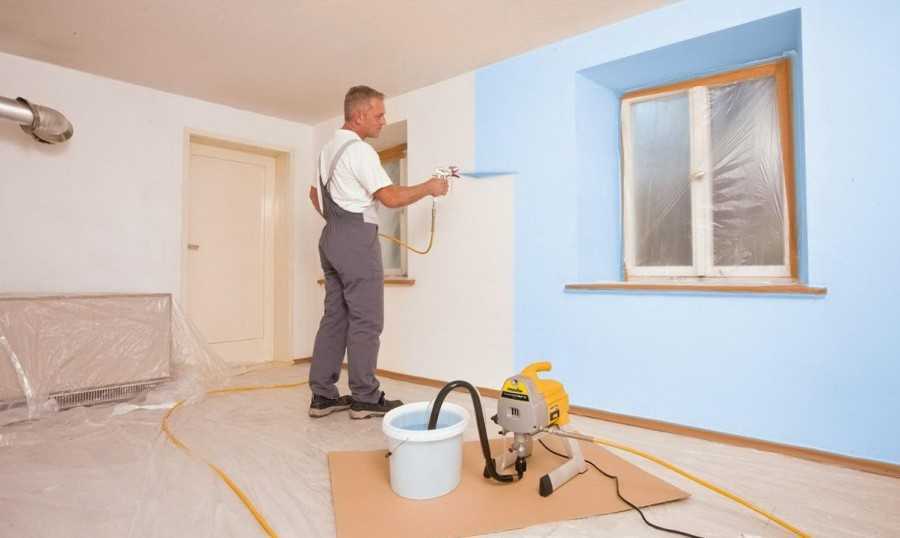 Краскопульты или же краскораспылители используются тогда, когда окрасить необходимо большую площадь. Они позволяют значительно сэкономить время на проведение малярных работ, создают ровное покрытие, без потеков и остатков щетины. С другой стороны, точность при нанесении краски такими устройствами ниже, чем при использовании кистей и валиков, но выход нашелся – можно использовать малярные ленты. Еще один минус – не очень экономный расход краски.