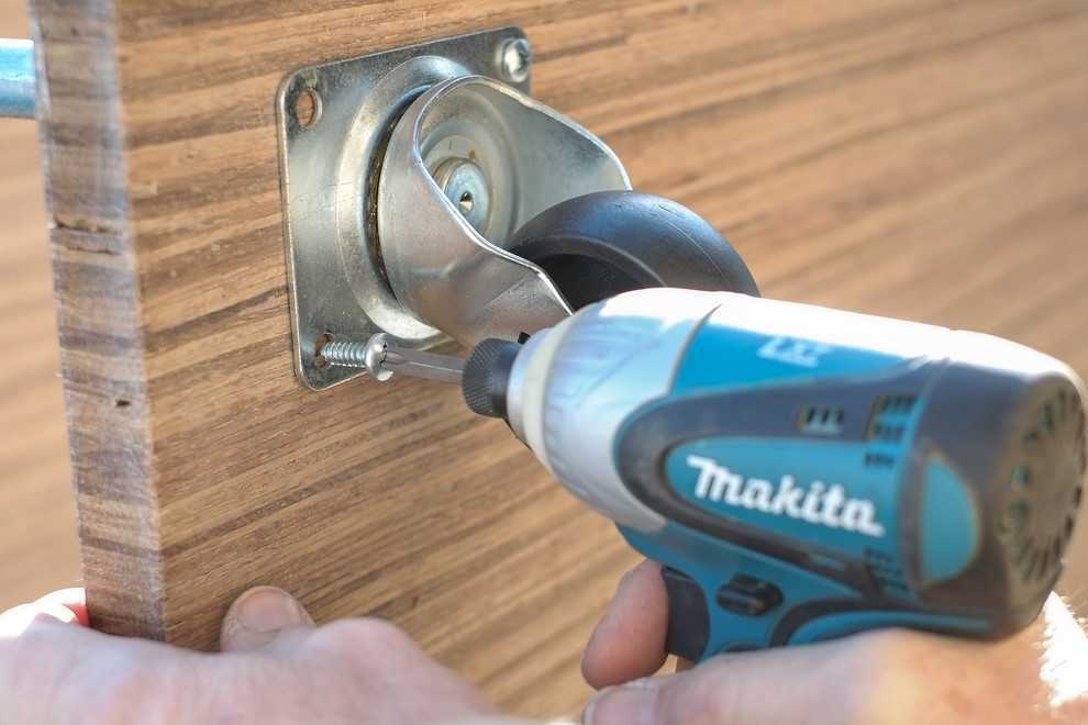 Следующий шаг – монтаж резьбовых втулок в ножки. Для этого следует сделать глухие отверстия нужного диаметра (40 мм глубиной), а затем ввернуть втулки отверткой.