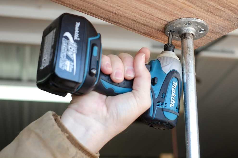 4. Используйте аккумуляторную дрель и деревянные винты, чтобы прикрепить фланцы к верхней полочке.