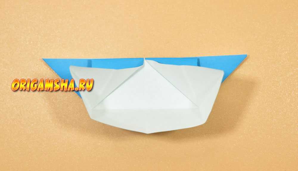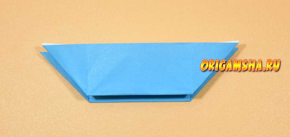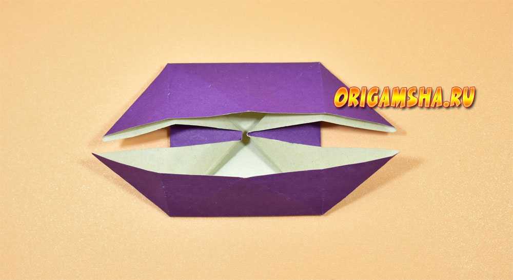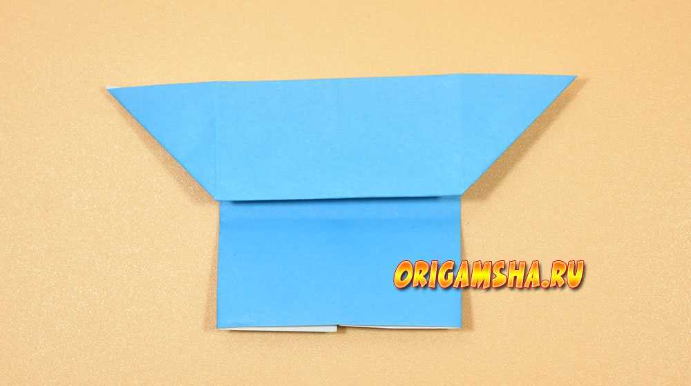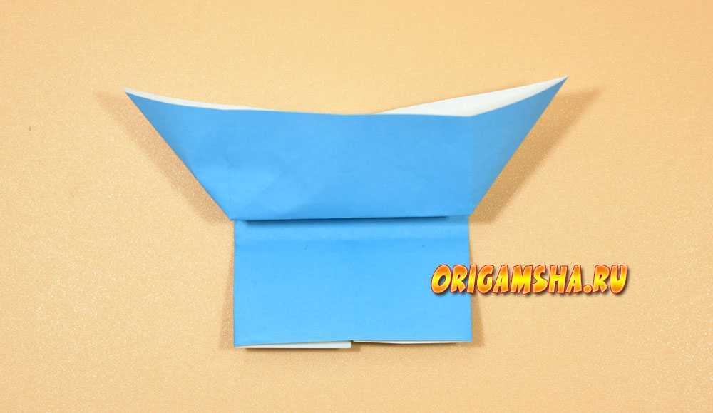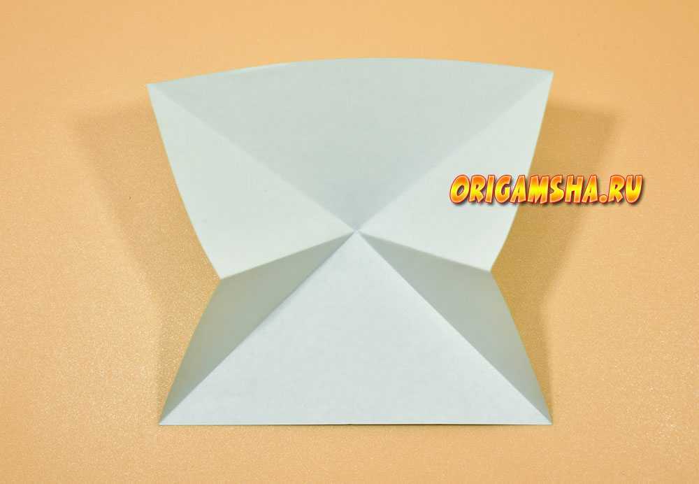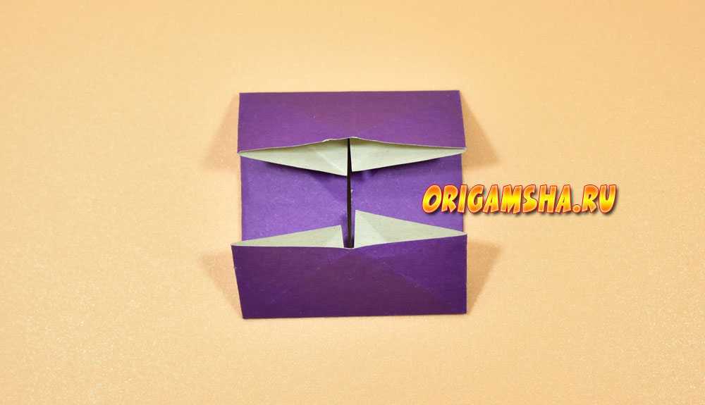 В верхней части расправьте сомкнутые в середине уголки в стороны, попутно направляя вниз верхний край бумаги.