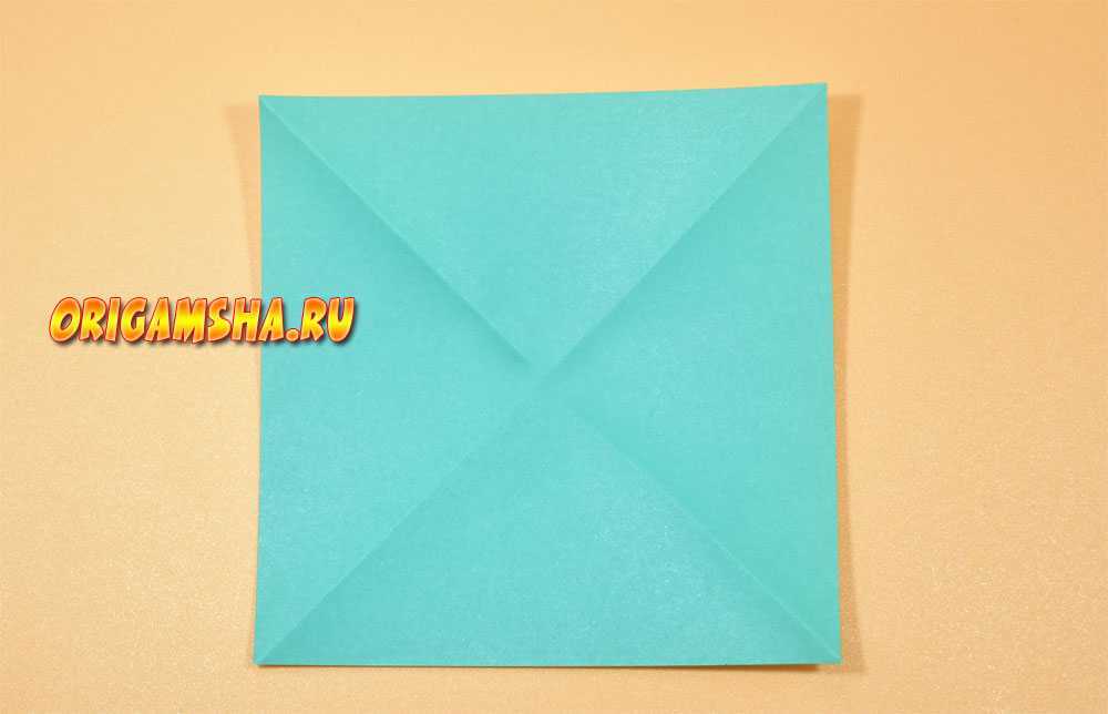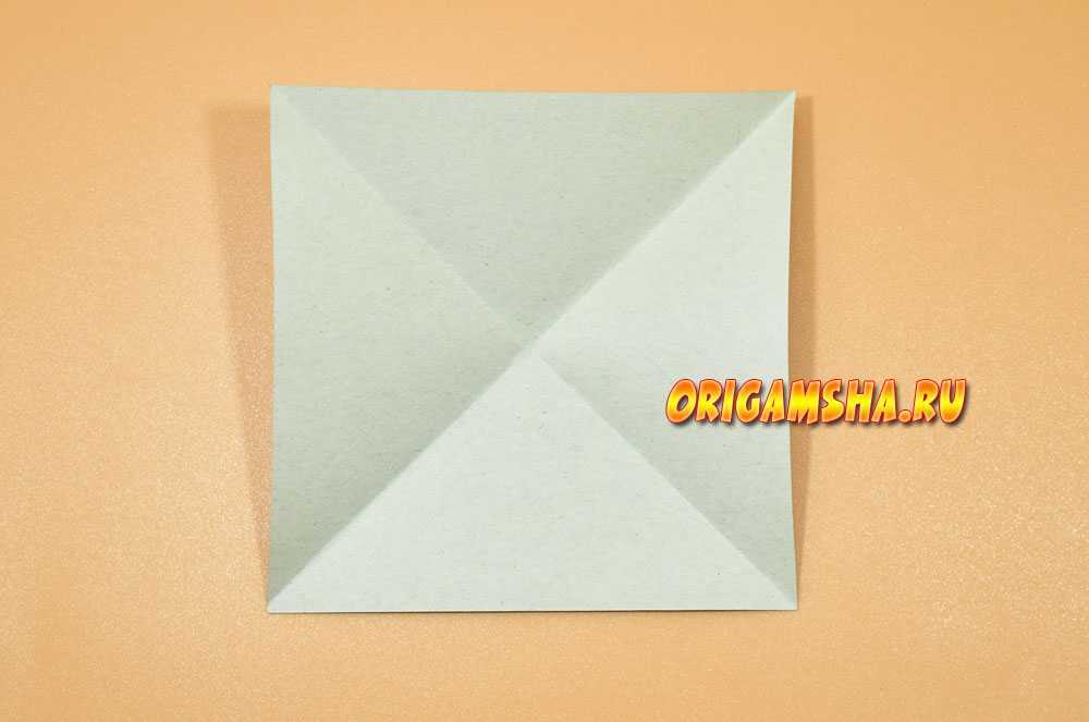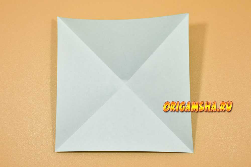 Сложите лист пополам, соединив два противоположных угла, расправьте, а затем снова сложите вдвое, на этот раз соединив два других уголка.