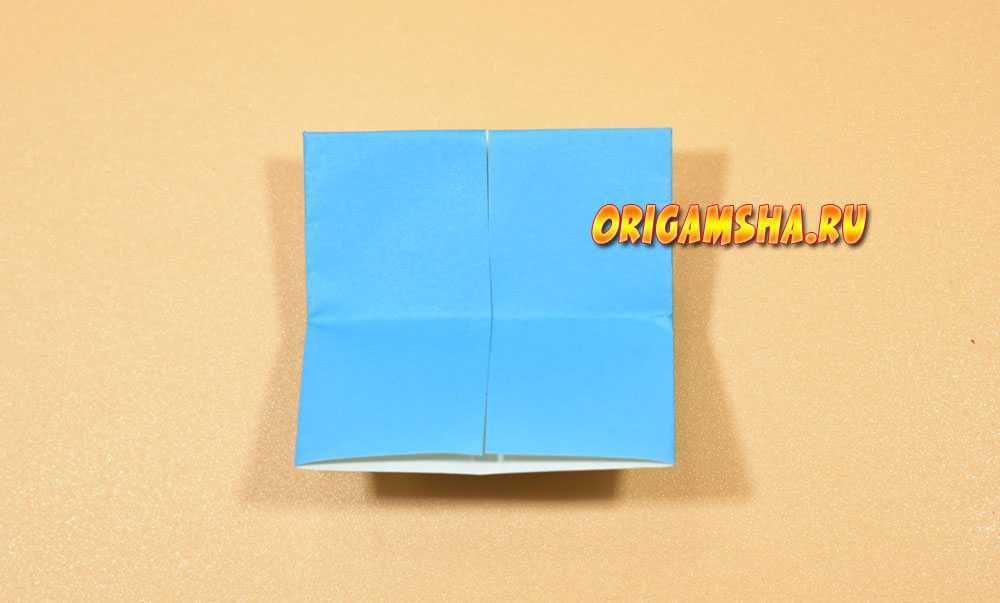 Раскрываем бумагу. Как видите, на ее площади образовались 3 сгиба, благодаря им нам будет легко сделать следующую фигуру. Направьте боковые стороны со сгибом в середину, попутно соединяя два верхних и два нижних уголка.