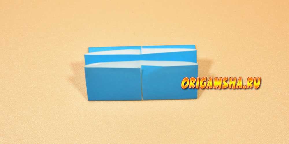 Раскрываем заготовку. После этого торчащие снизу детали загибаем кверху. Разворачиваем заготовку на другую сторону. Сгибаем уголки свернутых частей вовнутрь.